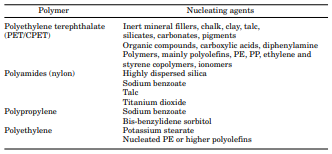 - Natrium benzoat – agen nukleasi tradisional yang murah dan banyak dipakai pada nilon serta homopolimer PP. Selain itu, bahan ini telah mendapat persetujuan penuh FDA untuk aplikasi pangan.