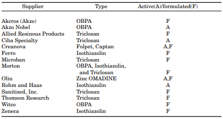 Biocides juga dikenal sebagai antimikroba, pengawet, fungisida, mildewcide, atau bakterisida. Ada beberapa jenis biocides yang memiliki tingkat toksisitas (racun) berbeda-beda. OBPA (10,10′-oxybisphenoxarsine) adalah jenis pengawet paling kuat yang umum dipakai pada plastik. Bahan lain seperti amine-neutralized phosphate dan zinc-OMADINE juga efektif, meskipun tingkat kerjanya lebih rendah. Di Amerika Serikat, semua biocides dianggap sebagai pestisida dan harus didaftarkan ke Badan Perlindungan Lingkungan AS (EPA) untuk tiap jenis penggunaannya.