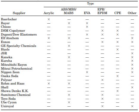 Rohm and Haas, Kaneka, dan Atochem merupakan pemasok terkemuka impact modifiers secara global. Ketiganya memiliki posisi kuat pada modifier berbasis akrilik maupun MBS. Elf Atochem lebih unggul dalam akrilik, sementara Kaneka lebih dominan pada tipe MBS. Rohm and Haas, termasuk usaha patungannya dengan Kureha di wilayah Asia/Pasifik, memiliki posisi yang lebih seimbang. Tabel menunjukkan pemasok global utama Impact Modifiers berdasarkan jenisnya.
