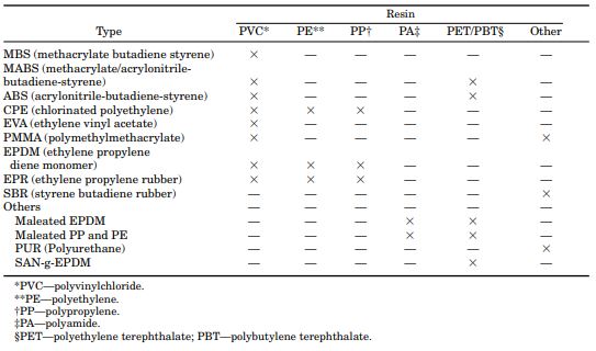 Impact modifiers digunakan secara luas pada berbagai jenis resin termoplastik untuk menyerap energi yang dihasilkan dari benturan dan mendistribusikannya secara tidak merusak. Perilaku dan definisi dari tergolong kompleks. Pemilihan jenis Impact Modifier bergantung pada kompatibilitas, kelarutan fisik, kinerja ketahanan benturan, serta biaya. Umumnya digunakan pada PVC, resin teknik, dan poliolefin. Tingkat penggunaannya sangat bervariasi tergantung pada jenis modifier, tipe matriks, dan sifat yang diinginkan. Jenis-jenis utama beserta resin tempat penggunaannya dapat dilihat pada tabel 14 berikut.