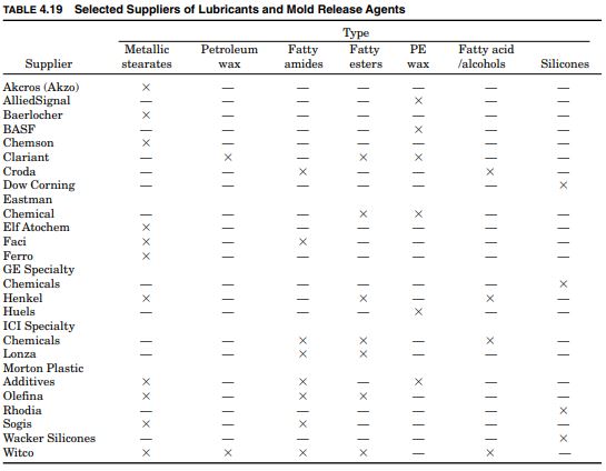 Terdapat banyak pemasok pelumas dan agen pelepas cetakan karena beragamnya jenis kimia yang berfungsi sebagai pelumas internal maupun eksternal. Pemasok umumnya adalah perusahaan kimia khusus berskala besar yang menjual produk kimia tertentu untuk berbagai aplikasi akhir. Volume penjualan pelumas dan agen pelepas cetakan untuk plastik biasanya relatif kecil dibandingkan total penjualan perusahaan.